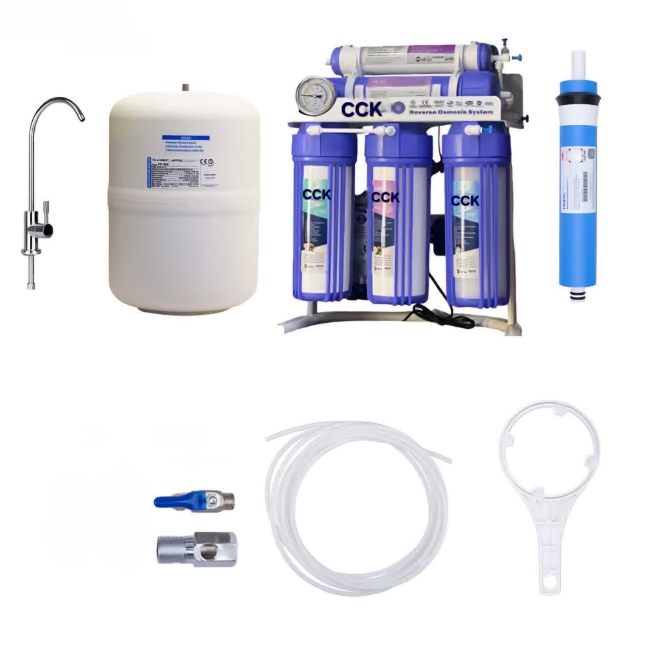 شما با استفاده از این دستگاه پیشرو ، مطمئن میشوید آب مورد استفاده شما ، آزاد از ذرات ناخواسته و با بالاترین کیفیت خودش است. دستگاه تصفیه آب سی سی کا در طی 7فیلتر و 7 مرحله آب را تصفیه میکند. مرحله هفتم دستگاه فیلتر محافظ ممبران است که باعث افزایش طول عمر ممبران می شود .بدون مواد شیمیایی یا افزودنی ، این سیستم فشرده و کم مصرف، آب تمیز و با طعم عالی را در خانه فراهم می کند. فیلتر ممبران این دستگاه 13 لایه ، مخزن تانک پک  ( 5 گالن) با گنجایش 19 لیتر آنتی باکتریال میباشد. این دستگاه دارای استاندارد های جهانی FDA _ WQ _ CE _ NSF میباشد دارای بوستر پمپ قوی 125PSI و شیر تنظیم سختی آب و هوزینگ های دابل اورینگ برای آب بندی بهتر دستگاه میباشد همراه با شیر برداشت اهرمی پایه بلند شیک کروم و پک کامل لوازم نصب دستگاه سی سی کا شامل :آچار هوزینگ ، شیلنگ به مقدار کافی  ، شیر ورودی آب استیل، سه راهی استیل ،شیر مخزن و فیلتر ممبران است بدون صدا و لرزش - قابلیت نصب به ساید - قابل جابجایی آسان - دستگاه در زیر سینک آشپزخانه نصب میگردد.