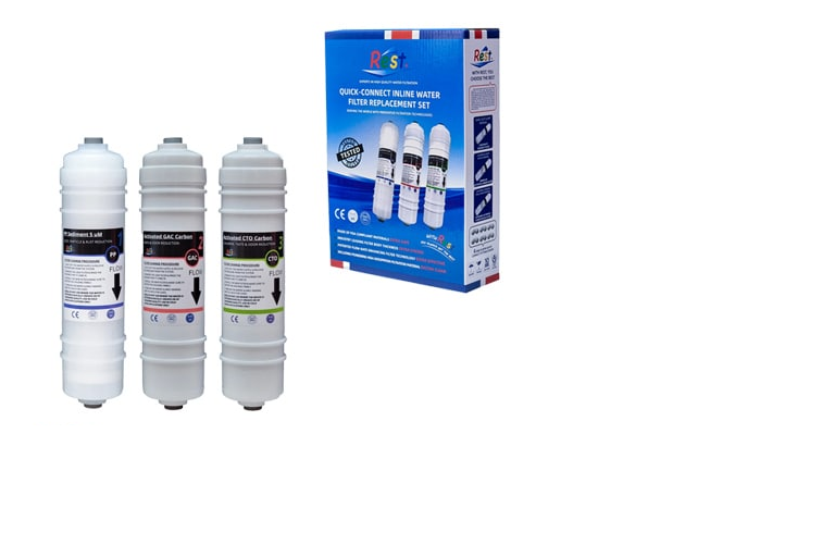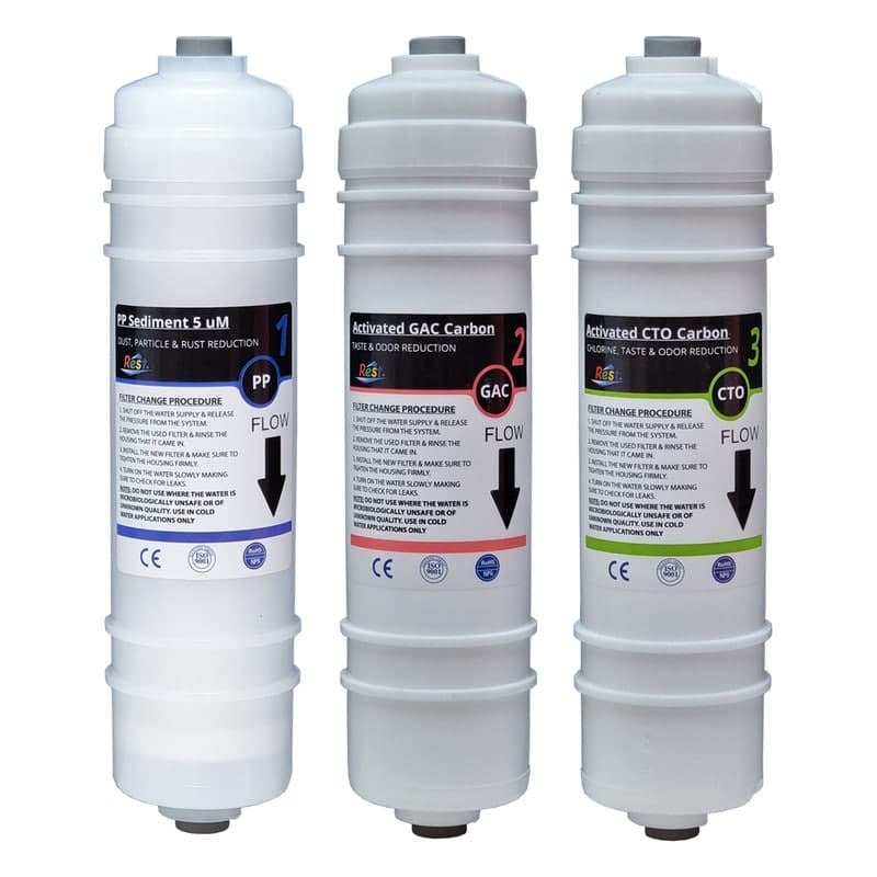 - (فیلتر مرحله اول یا الیافی-PP) در مرحله اول این پک می توان فیلتر الیافی ۵ میکرون را مشاهده کرد. که وظیفه حذف آلودگی های بزرگ را برعهده دارد و می توان با استفاده از این فیلتر به راحتی تمامی حذف شن و ماسه، گل و لای، خاک، لجن، زنگ لوله ها، جلبک، رسوب و ذرات را حذف کرد. ۲- (فیلتر مرحله دوم،کربن پودری-UDF) در فیلتر اینلاین یکی از مهم ترین مراحل مربوط به قسمت فیلتر دوم پودر کربن یا همان ذغال اکتیو کاملا گیاهی می باشد. این پودر با داشتن کربن فعال می تواند در زمانی بسیار کم به راحتی با انواع سموم موجود در آب واکنش نشان دهد. توجه داشته باشید که در فیلتر اینلاین این کربن به صورت طبیعی یا گیاهی قرار داده شده است. در مدل های بی کیفیت از کربن های صنعتی یا همان ذغال صنعتی ساخته شده استفاده می کنند که برای تصفیه آب و سلامت بدن به هیچ وجه مناسب نمی باشند. هرچه کیفیت در کربن به کار رفته بالاتر باشد در زمانی کمتر آلودگی ها پاک می شوند. در نظر داشته باشید که در مرحله دوم تمامی مواد شیمیایی موجود در آب با دقت بالایی جدا می شوندهمچون حذف کلر و ترکیبات کلر، تری هالومتان ها، هالو استیک اسیدها، مواد ۳- (فیلتر مرحله سوم، کربن بلاک- CTO) فیلتر کربن بلاک اینلاین جهت تکمیل عملکرد فیلتر مرحله دوم و حذف مواد شیمیایی موجود در آب می باشد توجه کنید اکثر غریب به اتفاق پک های سه عددی فیلتر اینلاین در بازار فیلتر مرحله سوم آنها فیلتر الیافی ۵ میکرون یا ۱ میکرون می باشد در درحالی که اکثر محصولات با کیفیت فیلتر مرحله سوم آنها کربن بلاک می باشند. همچین لازم به توضیح هست همراه این پک فیلتر ۶ عدد زانو دو سر فیتینگ جهت نصب آسان فیلترها ارائه می شود.